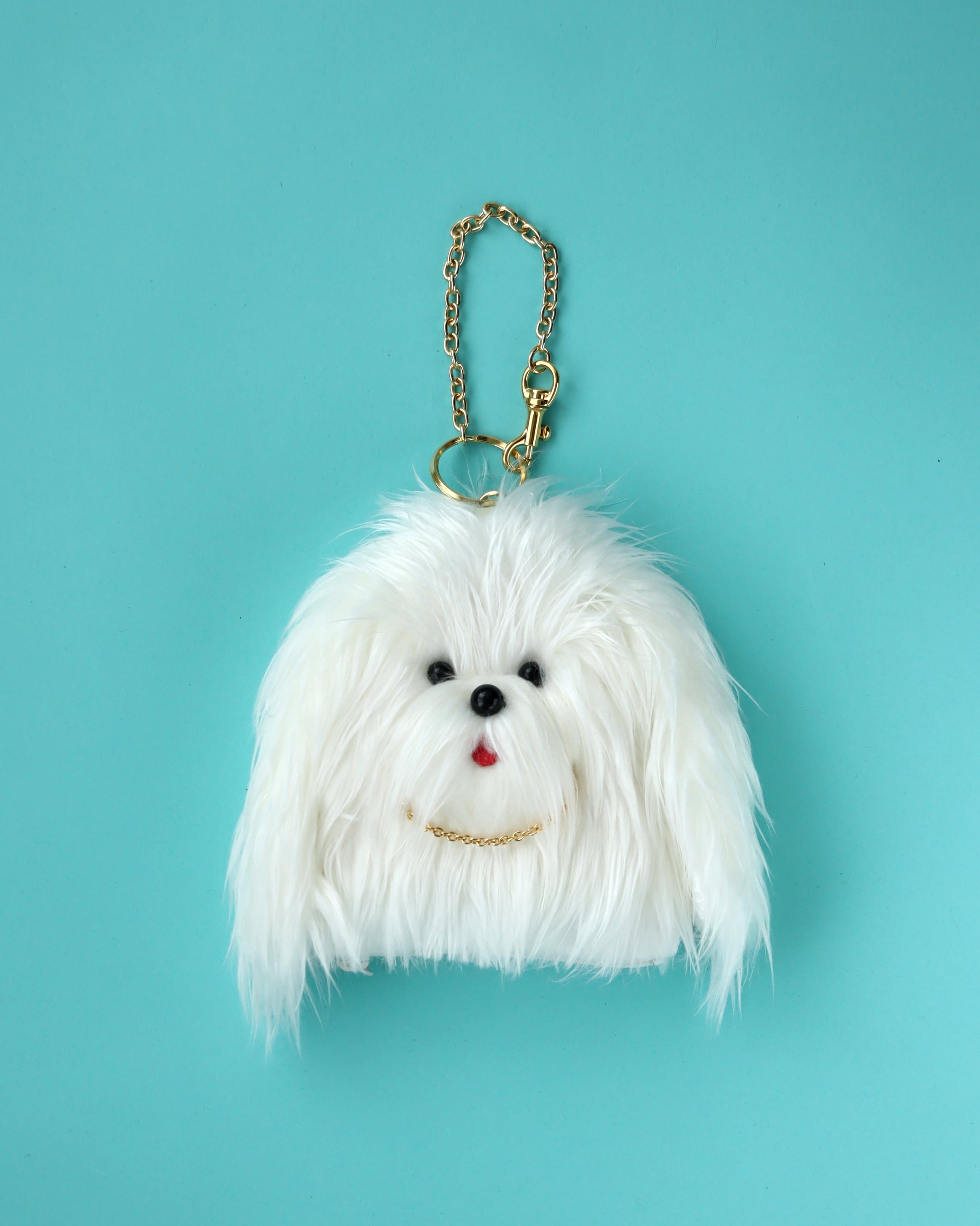 □チェーン付きのナスカンとキーリングがついた、ロングヘアー犬のミニポーチ。