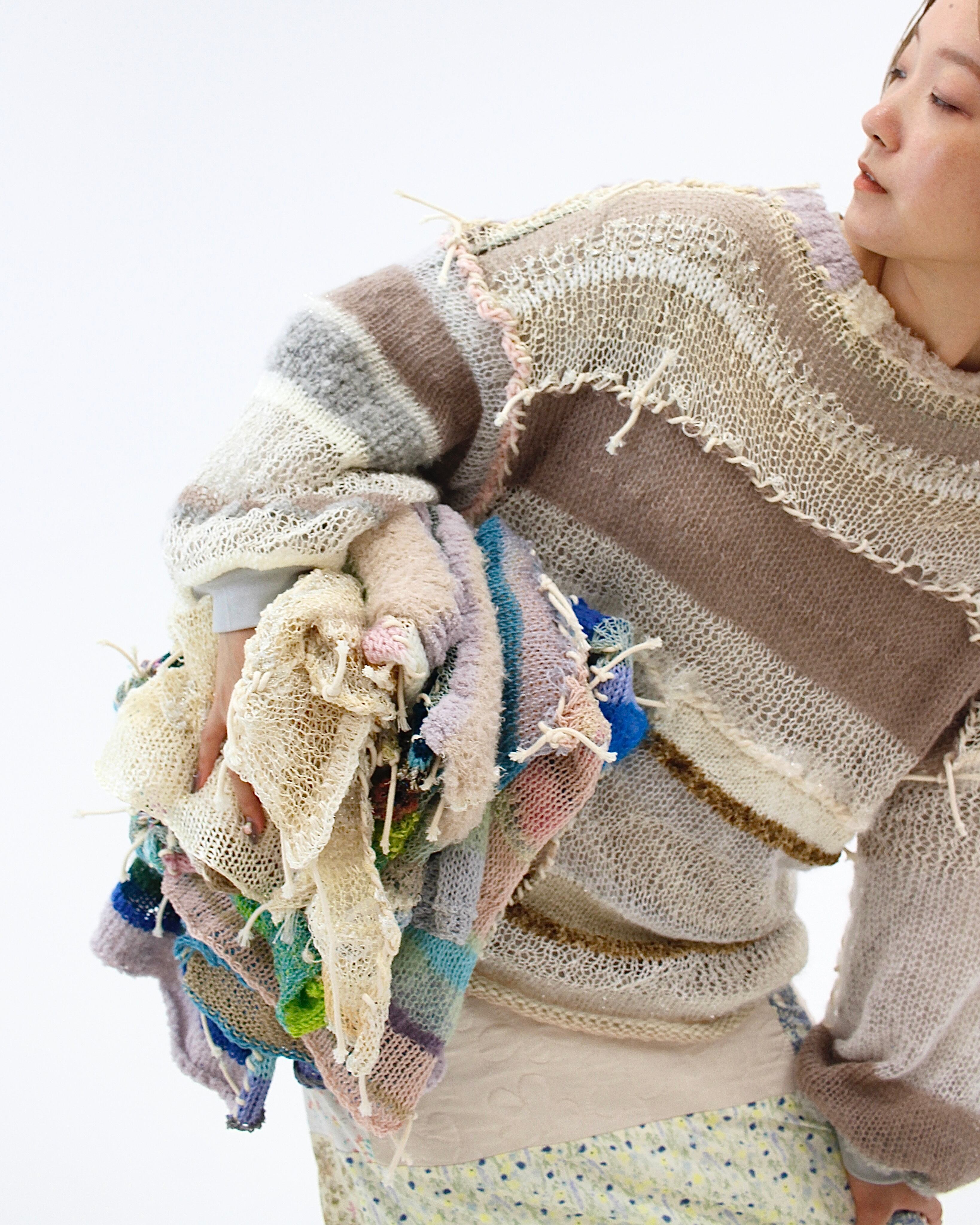 思いのままに編んだニットピースたちを、コットンロープの手縫いで繋げたセーター。