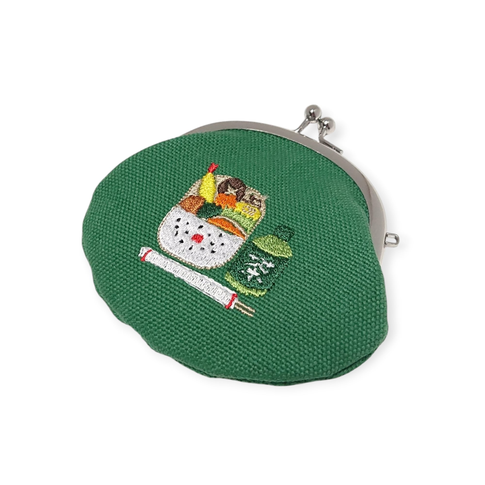 刺繍はとってもリアルなデザインで、がま口部分に紐やチェーンが付けられるフック付きです。