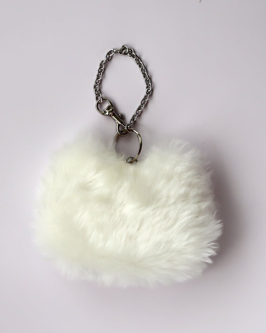 □チェーン付きのナスカンとキーリングがついた、ふわふわで光沢のある毛並みがすてきなキャットミニポーチです。
