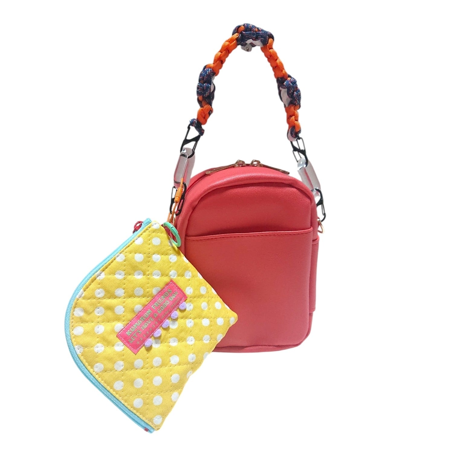 裏面にポケットもついていて便利です。ぬいぐるみポーチと同色の持ち手も一緒にお付けしてお届け致します。
