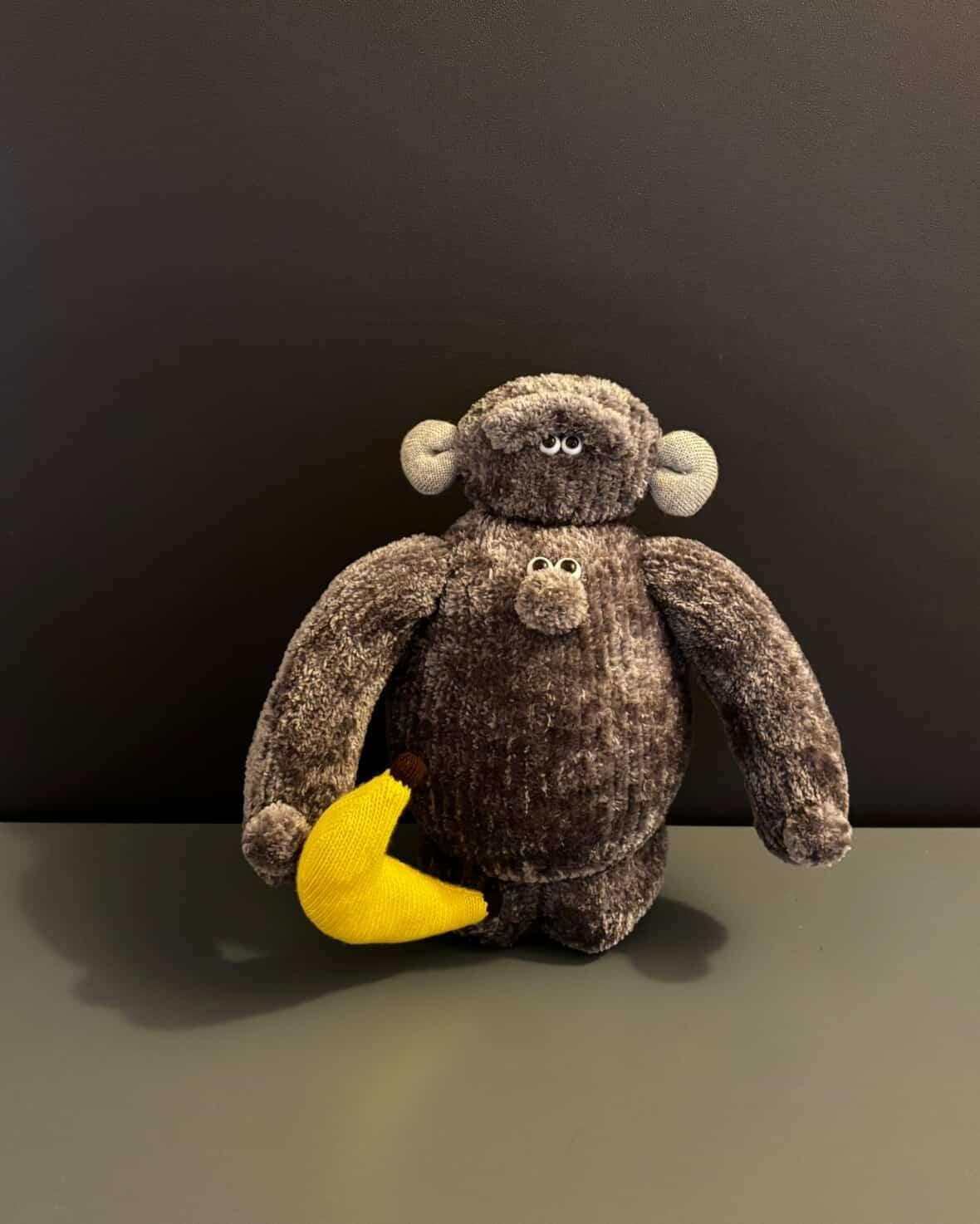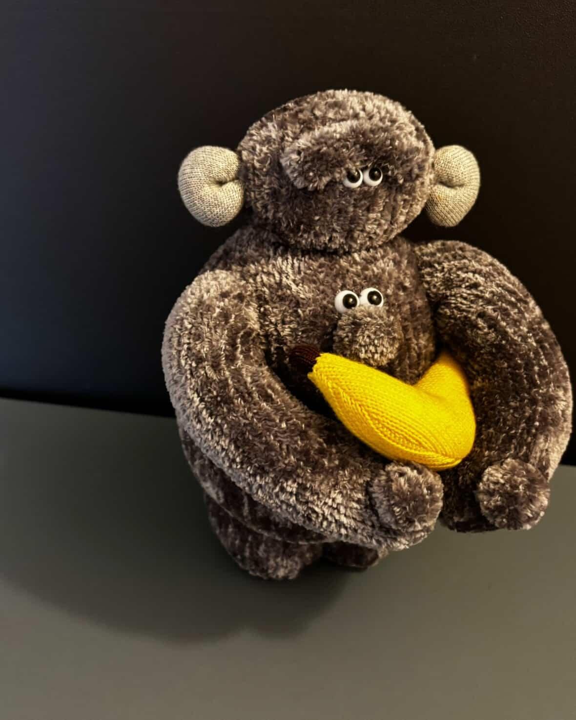 ゴリラゾッケは、手とバナナに磁石が入っていますので ”ムギュー”っと抱っこしたポーズを取ることが可能です。お好きなポーズにしてお楽しみ下さい♡