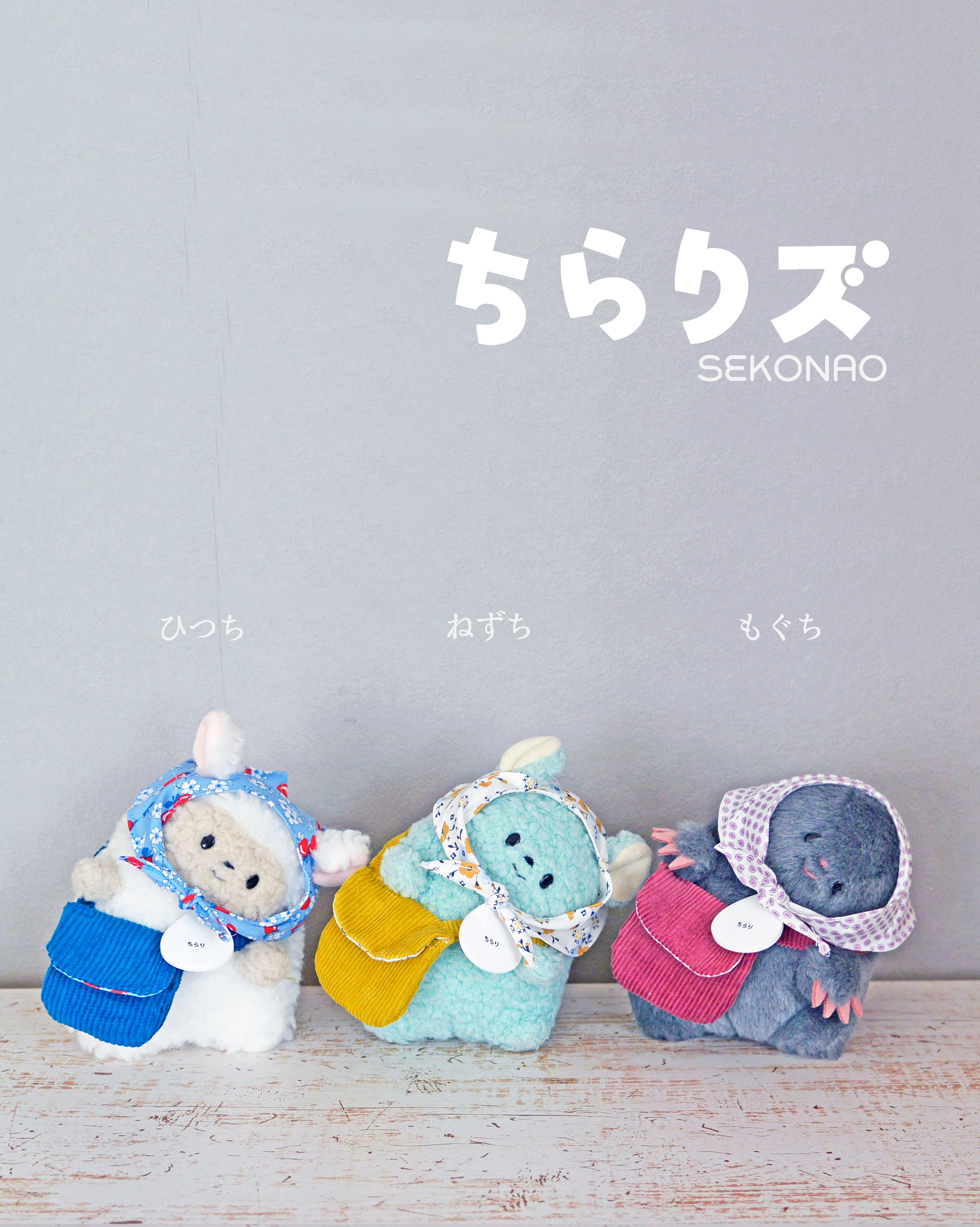 □首をかしげて“ちらり”と覗くような愛くるしい姿が特徴のぬいぐるみシリーズ「ちらりズ」。