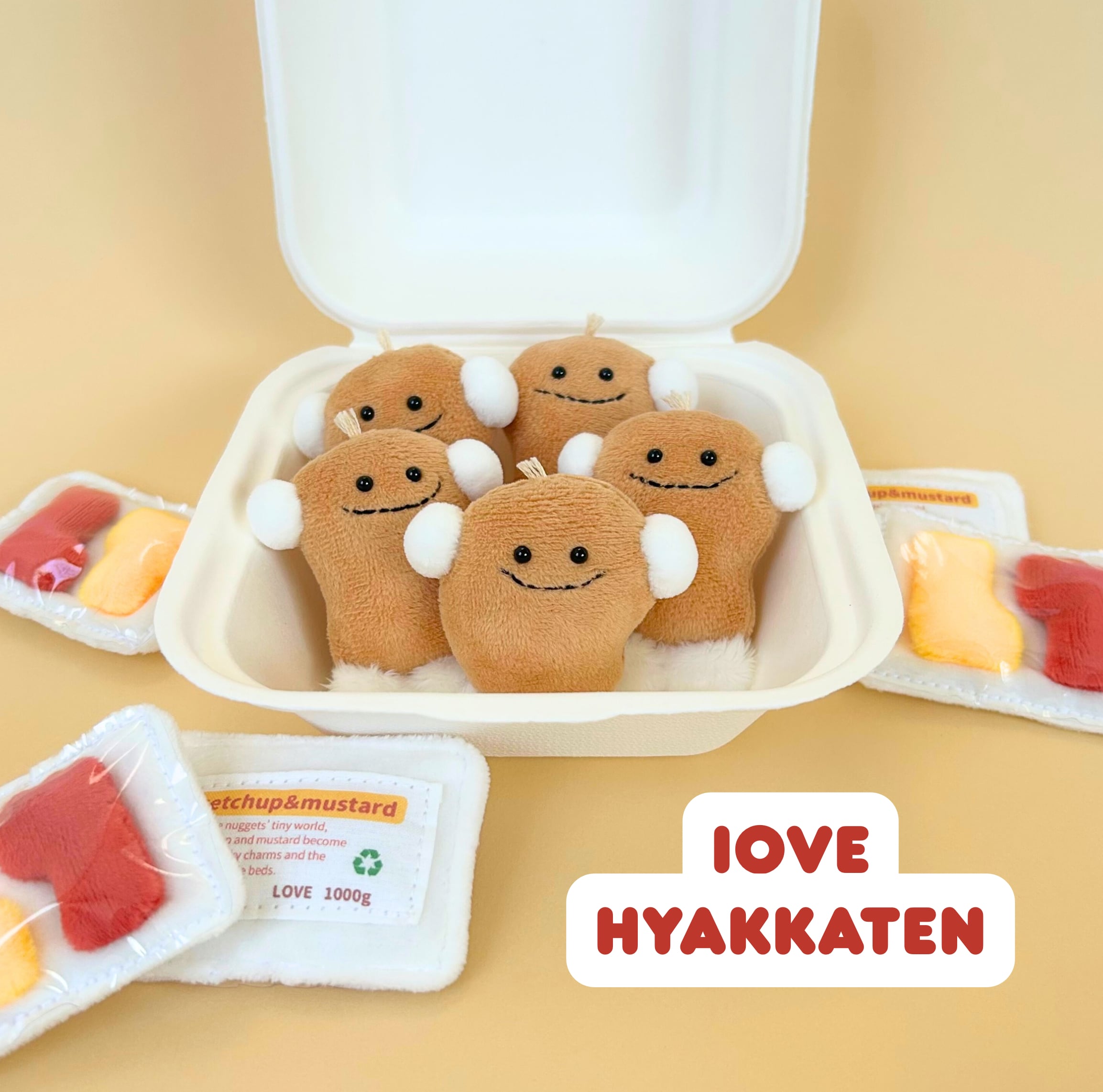 □初お披露目の小さいながらもジューシーなチキンナゲット。ナゲットにとってケチャップとマスタードはお守りでありベッドです。離ればなれにならないようマグネットでくっ付く仕様になっています。