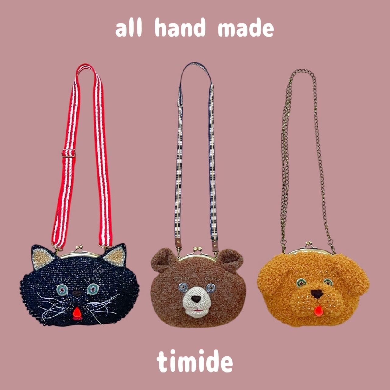一緒に楽しく過ごしてもらえるようなアニマルモチーフのがま口を、全て編み物で仕上げています。お出かけの時など迎え入れてくれたご主人様のお役に立つ事ができると、アニマル達もきっと喜んでくれると思います。