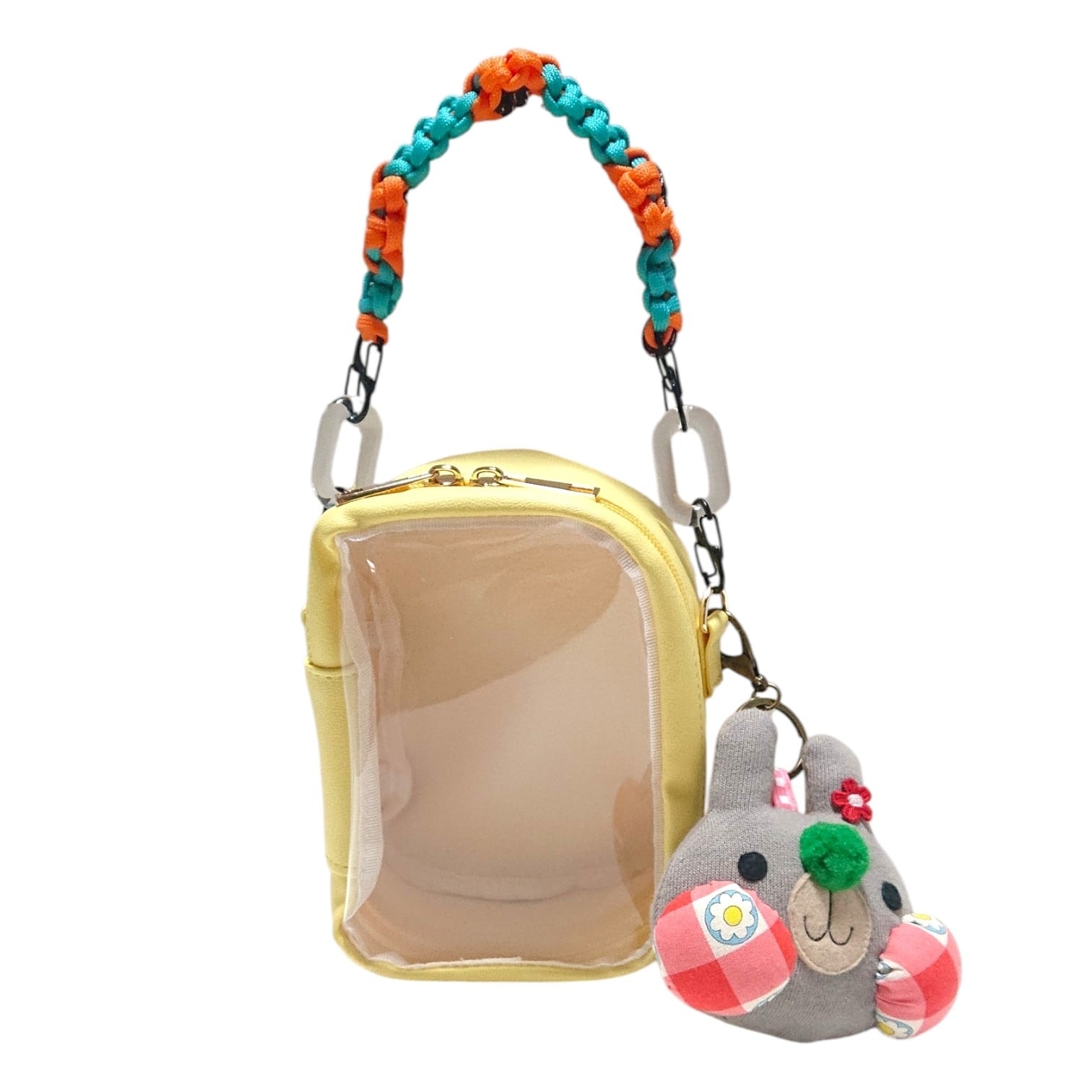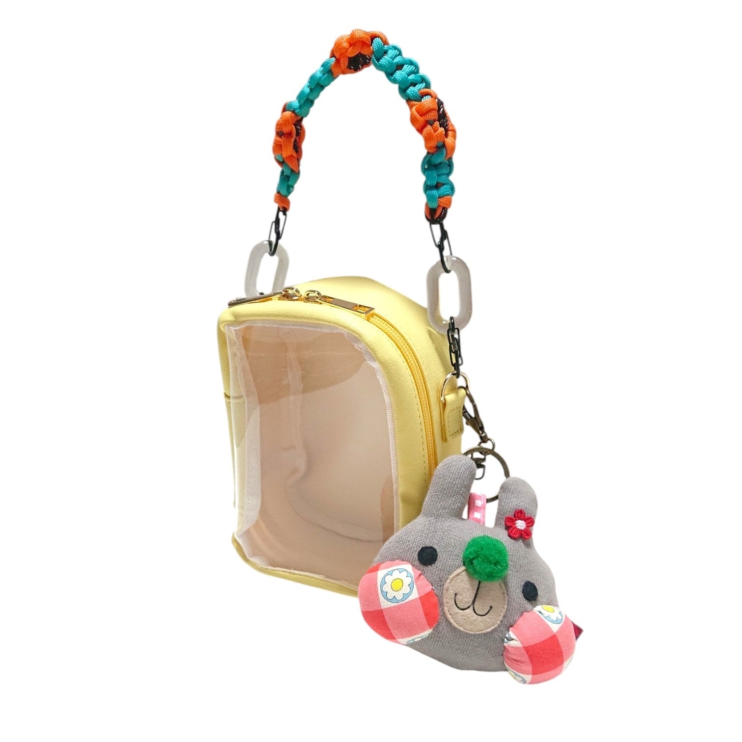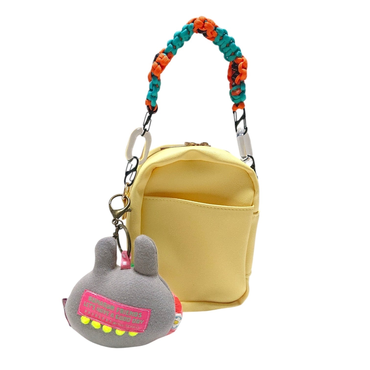 うさるんの可愛いキーホルダーと、持ち手もお花モチーフデザインの可愛いぬいぐるみポーチは裏面にポケットもついていて便利です。ぬいぐるみポーチと同色の持ち手も一緒にお付けしてお届け致します。