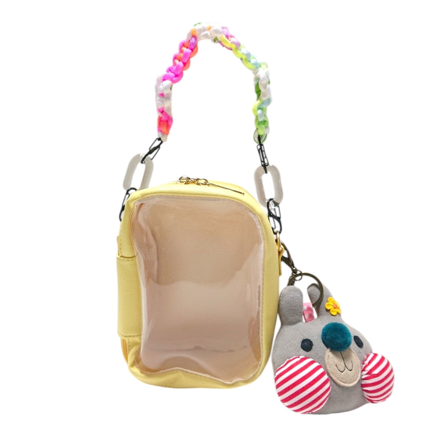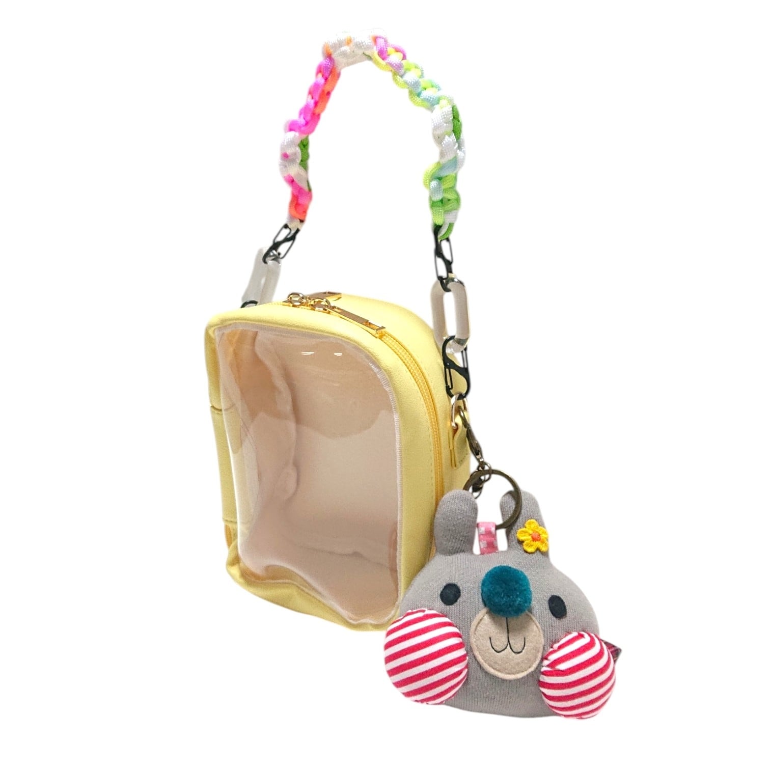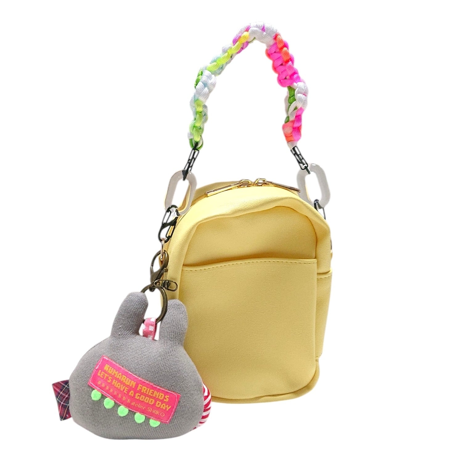 うさるんの可愛いキーホルダーと、持ち手もお花モチーフデザインの可愛いぬいぐるみポーチは裏面にポケットもついていて便利です。ぬいぐるみポーチと同色の持ち手も一緒にお付けしてお届け致します。